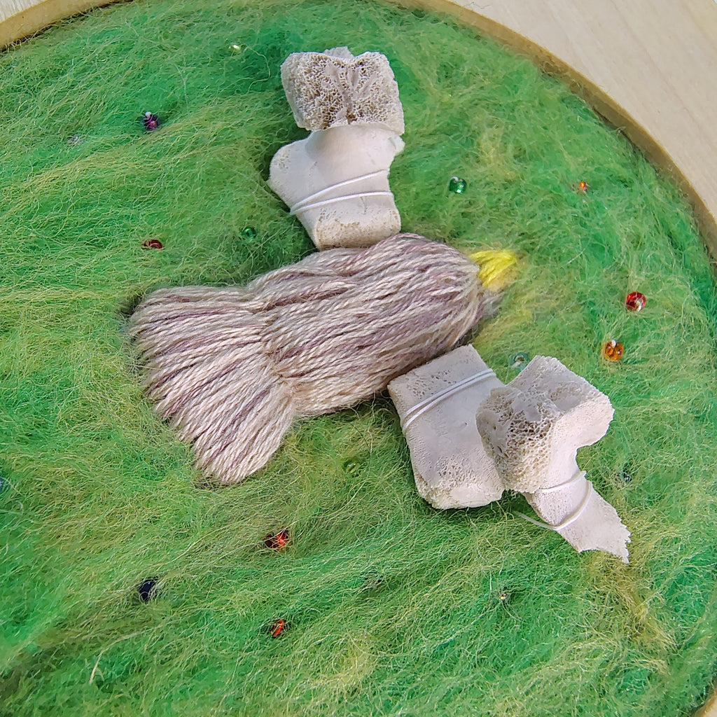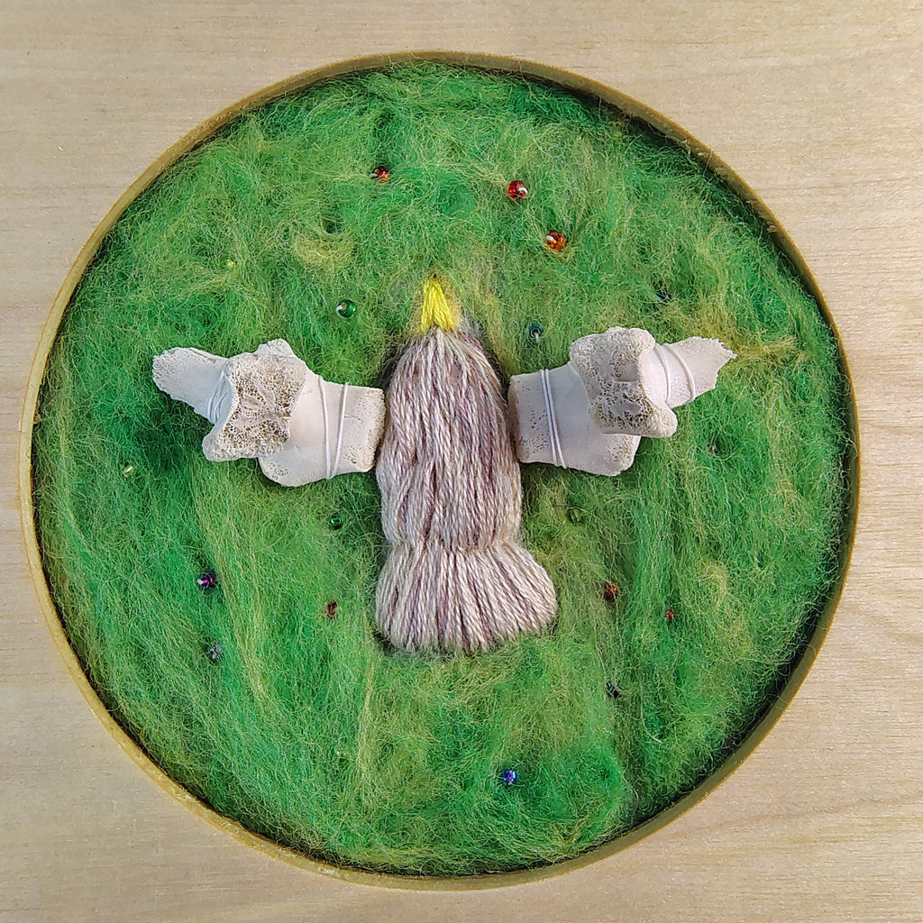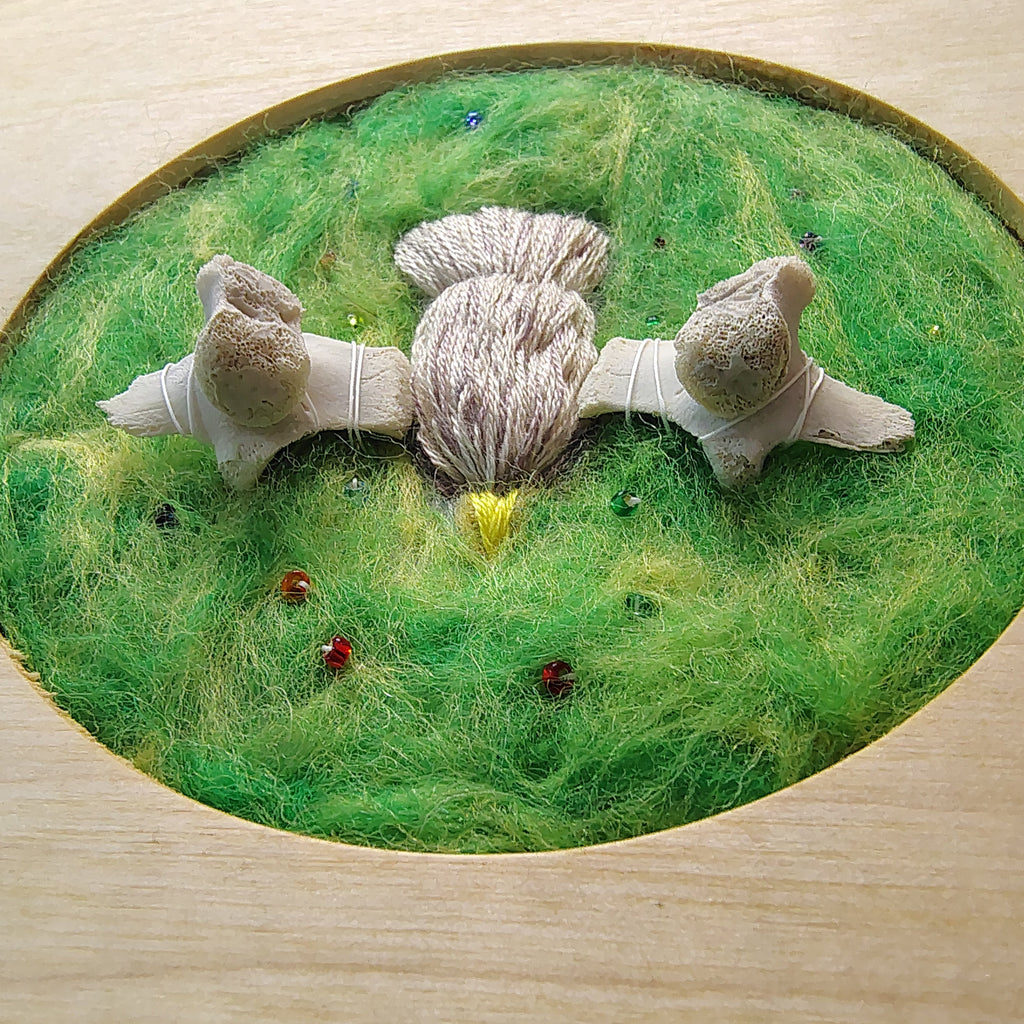 A wee little embroidered bird with wings made of bone on a needle felted background. Available for purchase at Bird Girl Bottle Shop during the Bird show. Must pick up from Bird Girl Bottle Shop in Hilton Village, Newport News, VA.